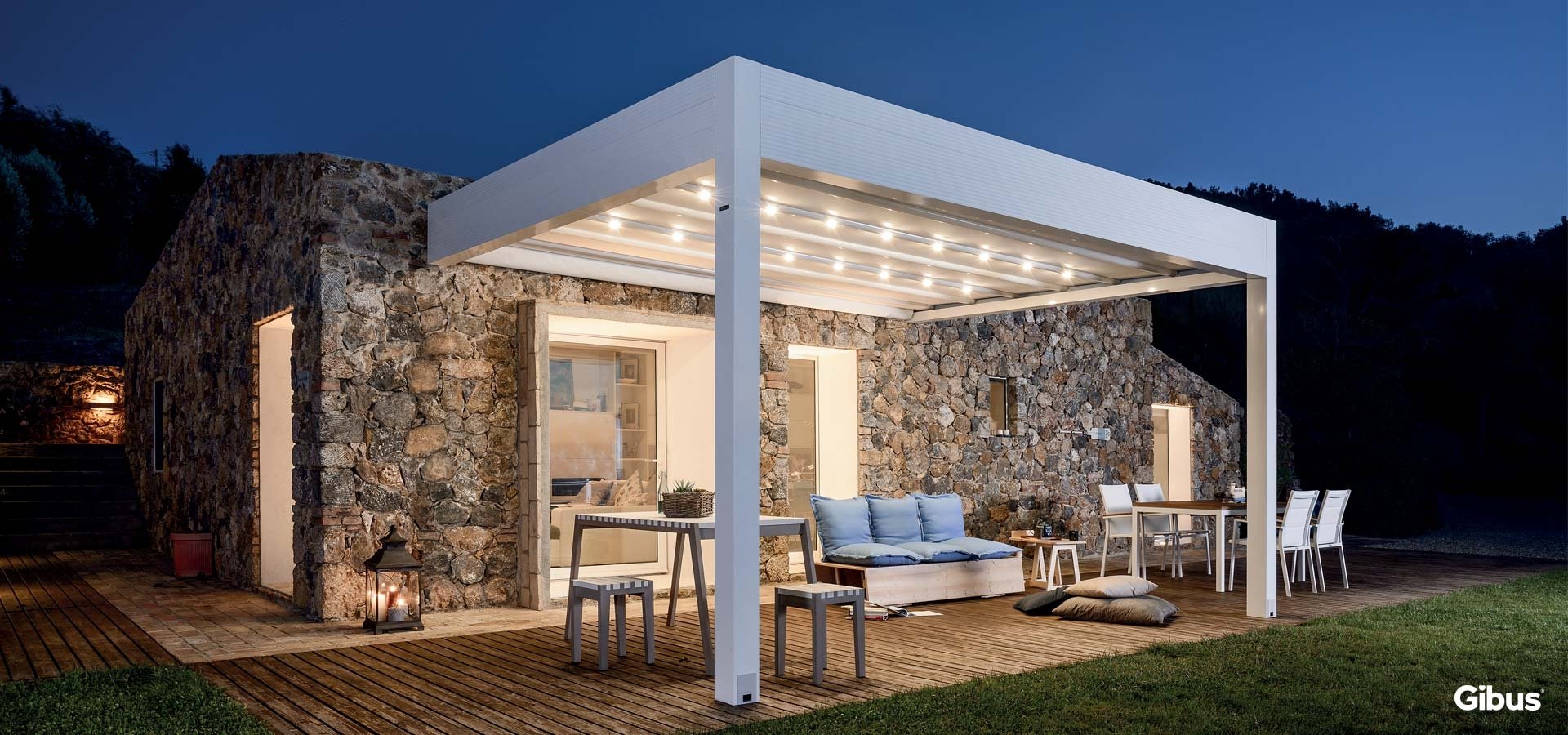 Per trascorrere i tuoi momenti felici all’aperto anche dopo il tramonto, puoi completare la tua Stanza del Sole® con i sistemi d’illuminazione a led Gibus.